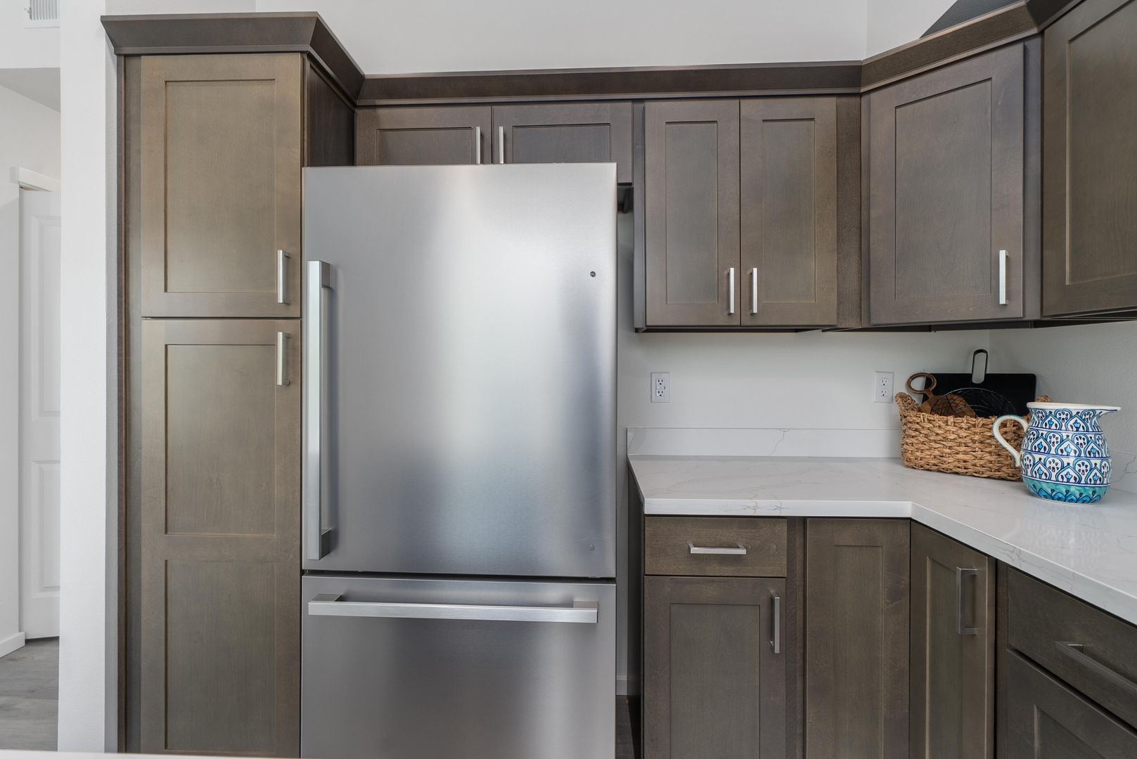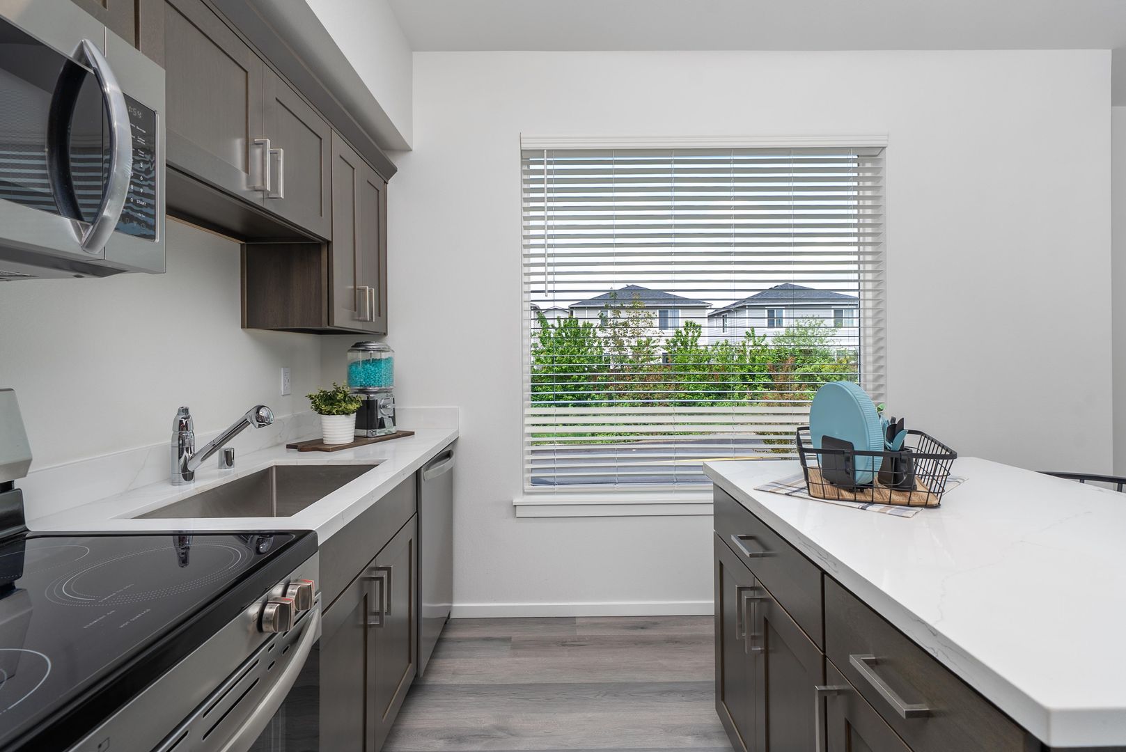 Our Port Orchard apartments are pet-friendly, ensuring your furry friends feel right at home. Inside, you'll enjoy air conditioning, efficient heating, and a bright, open-concept living space. The large windows flood the rooms with natural light, highlighting the wood-like luxury vinyl plank floors. The fully-equipped kitchens are designed for both functionality and style, featuring quartz countertops, custom soft-close cabinetry, a spacious sink with a pull-out faucet, and top-tier stainless steel appliances, including an extra-large fridge with French pull-out freezer, electric oven, glass-top stove, microwave, and a fully-integrated dishwasher.